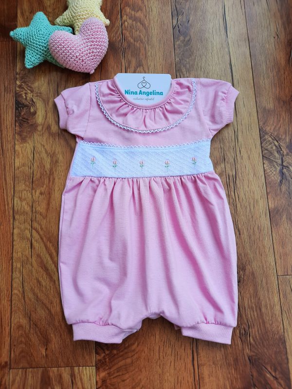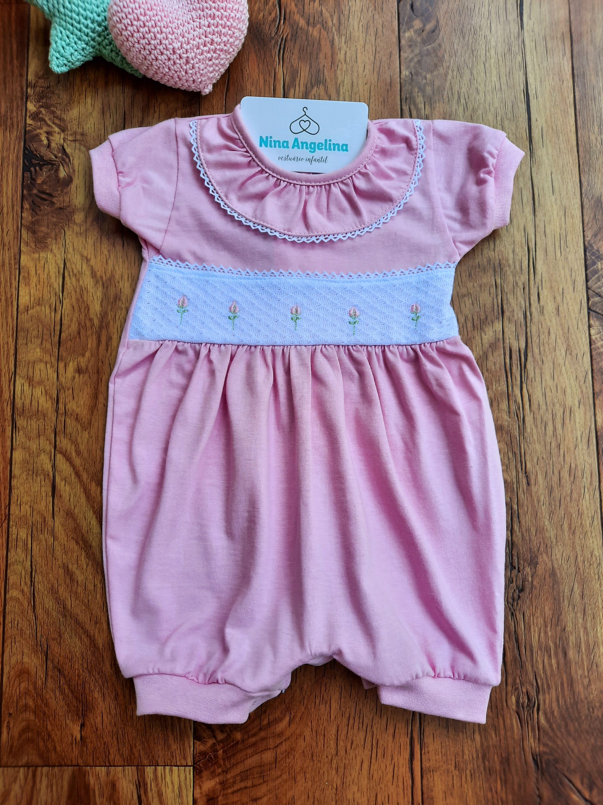 Macacão com pala bordada Tulipas e babadinho na gola.