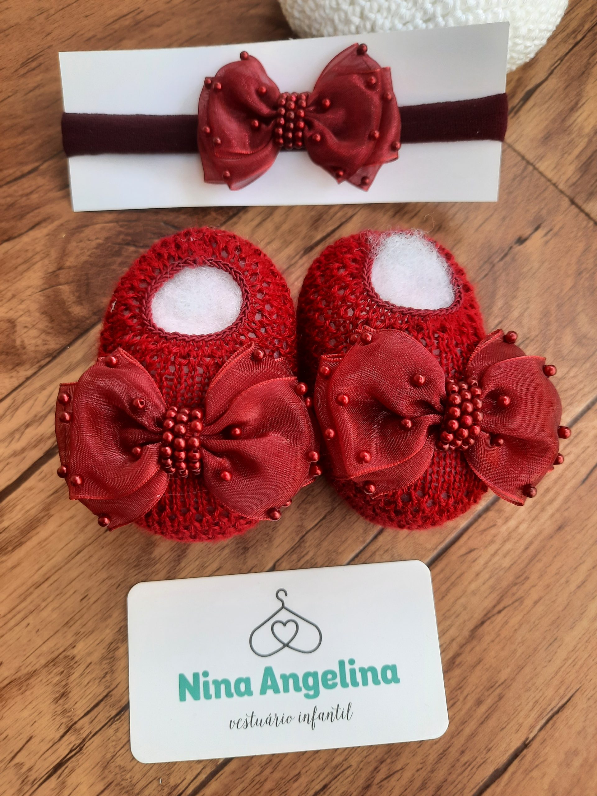 Sapatinho em Tricot com Aplique de Laço de Organza Bordado Pérolas + Tiara de meia de seda.