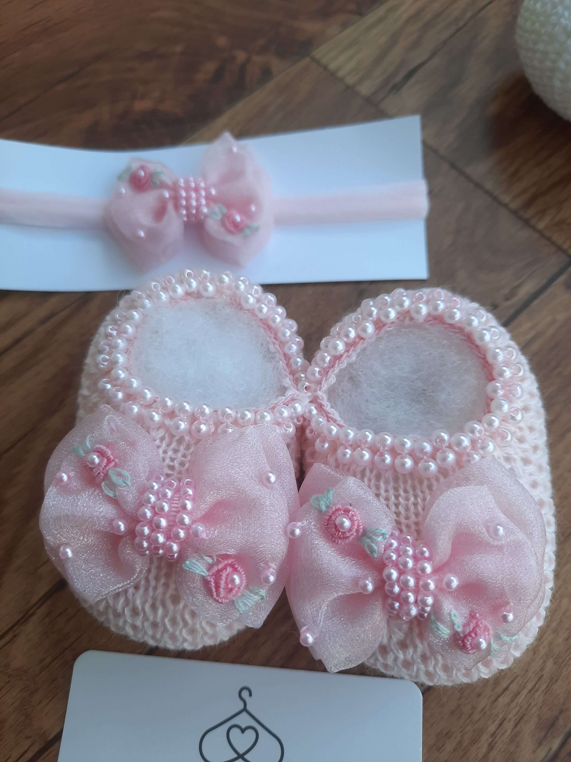 Sapatinho em Tricot com Aplique de Laço de Organza Bordado Rococó Lateral + Tiara de meia de seda.